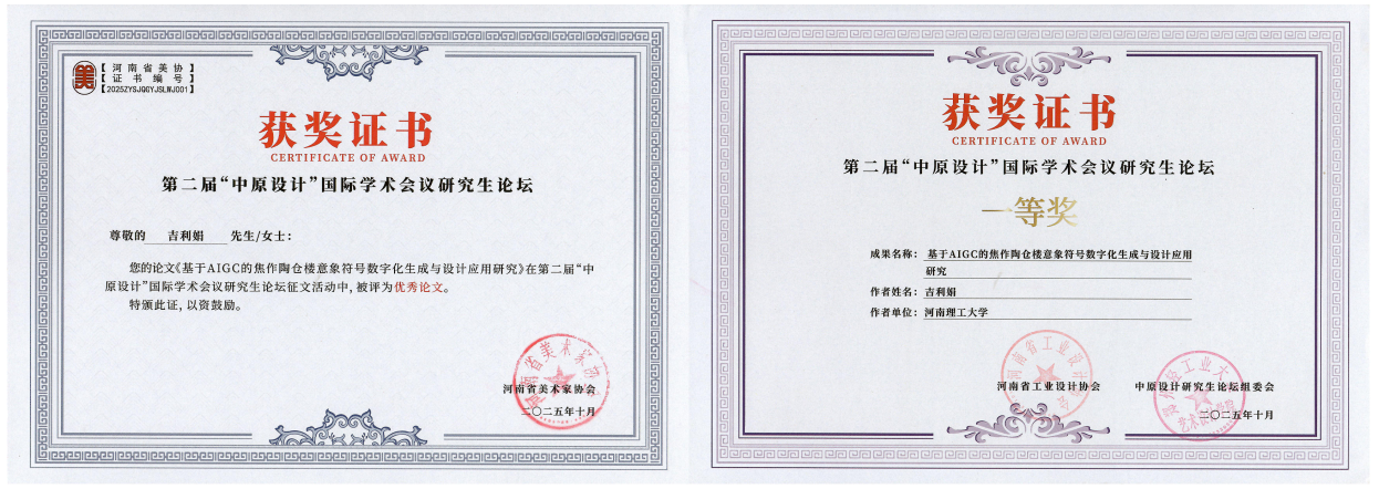艺术设计23级研究生吉利娟投稿的论文《基于AIGC的焦作陶仓楼意象符号数字化生成与设计应用研究》经大会专家评审荣获一等奖,并应邀在大会作主题报告,充分展示了做爱自拍
