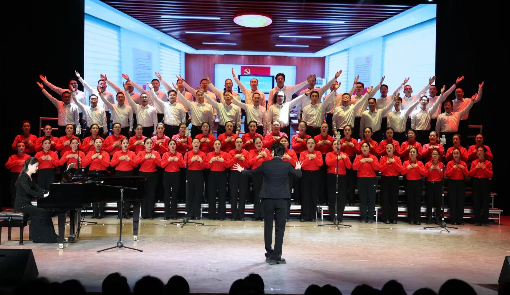 教职工的演唱从悠扬婉转的倾诉,逐渐过渡到激昂高亢的赞颂,情感层层递进。温润又充满力量的歌声,将对党的无限热爱与感恩之情表达得淋漓尽致。整齐的队形、优美的歌声、真挚的神情深深打动了现场的评委与观众,台下掌声此起彼伏、经久不息。