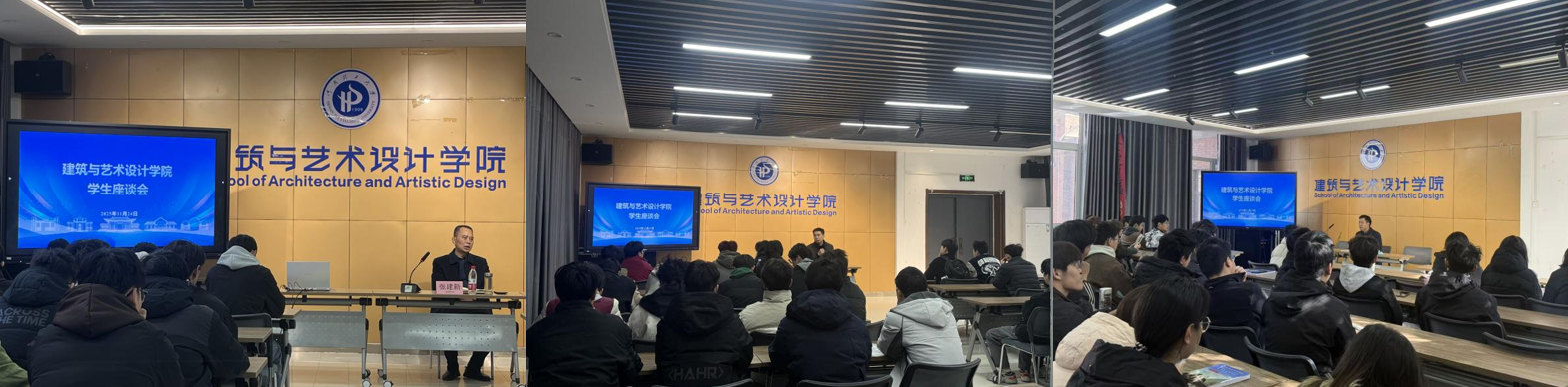 会议室与建筑、城规、风园、视传、环设、工设等24级各专业学生开展专题座谈,围绕学习规划、就业发展、生活习惯、价值塑造等核心话题深入交流,为学生成长导航。